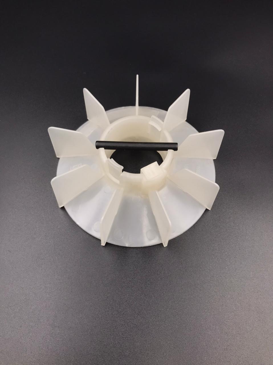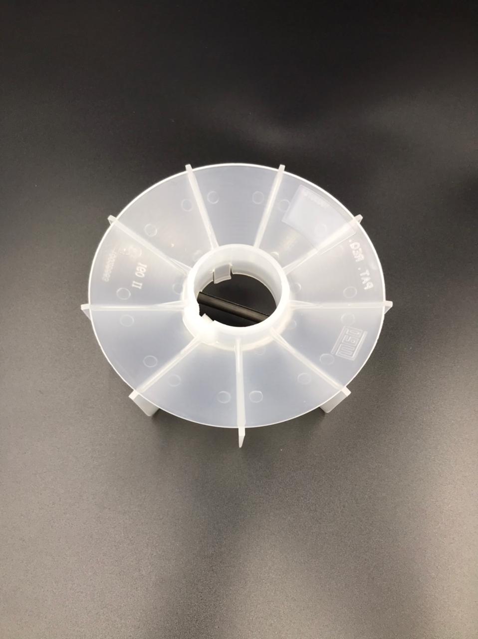 El aspa WEG original, su objetivo es colaborar en la reducción o disipar la t° del equipo debido a la transferencia de calor desde el motor al que está montado y debido al calentamiento por fricción. Material: Polipropileno Homopolímero. En términos de el mantenimiento, requiere controlar dos puntos principalmente. El primero es mantener los canales de refrigeración limpios y el segundo es asegurar la integridad del ventilador. Asegurando estos dos puntos el motor trabajará perfectamente a nivel de refrigeración. Pero no todo iban a ser ventajas. El gran inconveniente de estos motores reside en que el sistema de ventilación utiliza un gran flujo de aire para enfriar. Esto en ambientes muy sucios lo que hará será ensuciar mucho el motor. Esto último nos obligará a realizar limpiezas del sistema de refrigeración más a menudo. Otro inconveniente es su uso con variadores de frecuencia. Si el motor trabaja muy por debajo de su velocidad nominal estaremos bajando el caudal de aire. Características: